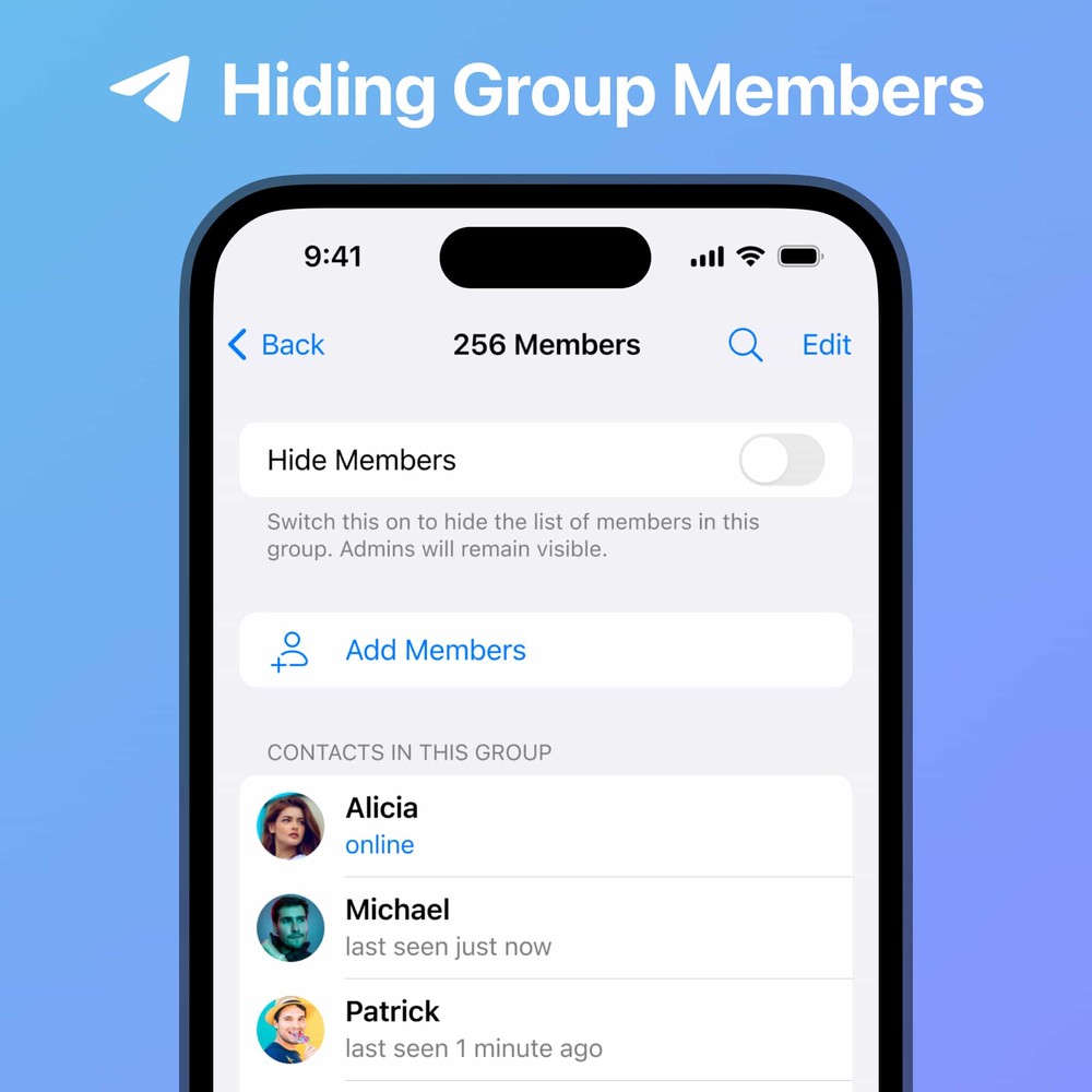 Managers of groups with more than 100 members will be able to hide the list of participants, giving inactive members more privacy. “If people don’t send messages in the group, only moderators will know they are there,” Telegram explains.